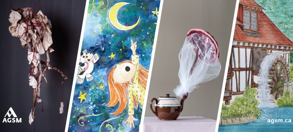 images, left to right: Alexandra Ross, Arrival Root (2021) Mixed media; Cyndi Wiebe, Onward (2021), Watercolour and pen on paper; Kelly Klick, Herbal Persuasion (2021), Brown Betty teapot, wire, cord, wool, beads, veil; Kelly Muray, Waterwheel (2021) Watercolour on paper.