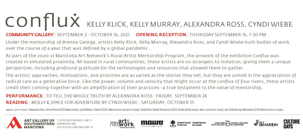 As part of the 2020-21 Manitoba Art Network and Mentoring Artists for Women’s Art, Rural Artist Mentorship Program, the artwork of the exhibition Conflux was created in simulated proximity. All based in rural communities, these artists are no strangers to isolation, giving them a unique perspective, including profound gratitude for the technologies and resources that allowed them to gather. The artists’ approaches, motivations, and priorities are as varied as the stories they tell, but they are united in the appreciation of radical care as a generative force. Like the power, volume and velocity that might occur at the conflux of four rivers, these artists credit their coming-together with an amplification of their practices–a true testament to the value of mentorship.